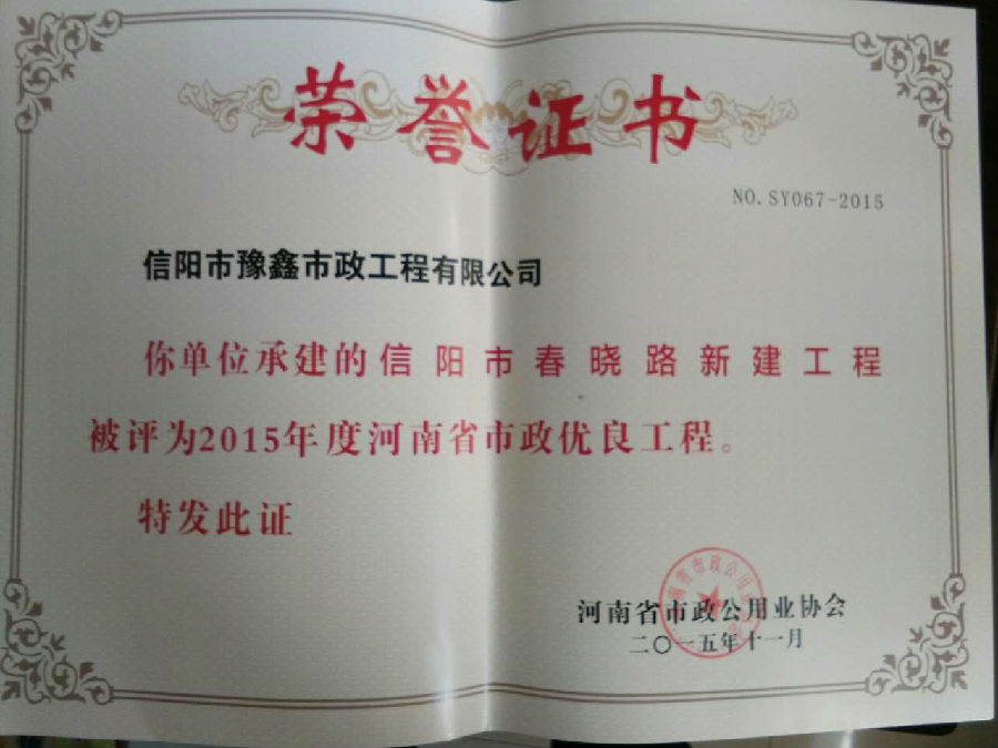 好風憑借力,送我上青云。近年來,公司積極參與城市市政基礎(chǔ)設(shè)施建設(shè)施工,積極參與市場競爭,先后承擔施工了市政府重點工程南京路道路改造工程、春曉路道路改造工程,東方紅大道道路改造工程、龍江東路新建工程等重點民生工程,其中南京路道路改造工程被省建設(shè)廳評為“中州杯”, 春曉路和東方紅大道道路改造工程被省建設(shè)廳評為“省優(yōu)工程”,成為城區(qū)一道道亮麗的風景線。參與施工了市典范小區(qū)“臺北城上城”、“恒大名都”以及師范學院、職業(yè)技術(shù)學院、交警支隊和軍區(qū)道路工程,參與施工了雞公山管理區(qū)、南灣管理區(qū)、明港鎮(zhèn)和羅山縣等部分道路小區(qū)工程施工,累計大小各類施工工程三百余項,企業(yè)影響力不斷擴大、輻射力不斷增強,市場份額不斷提高,企業(yè)信譽不斷彰顯,為信陽城市建設(shè)做出了積極貢獻,為企業(yè)的可持續(xù)發(fā)展插上了騰飛的翅膀。